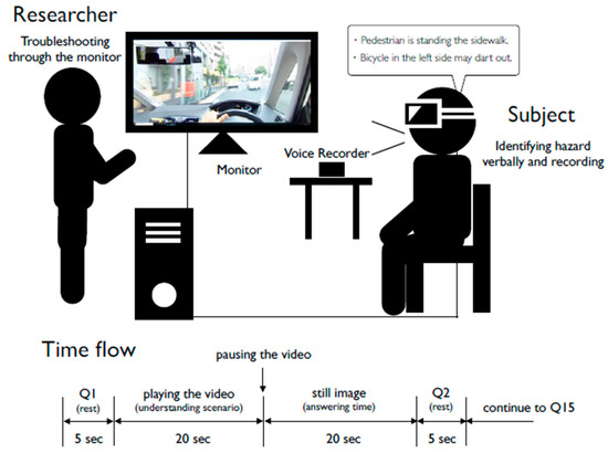 Prior to the hazard perception test, the researchers explained it to the subjects on paper, and the participants confirmed the experimental rule, such as answering about the hazard verbally or pointing out the hazard accurately by using a picture (about 5 min). Subsequently, the subject was seated on a chair and wore an HMD (HTC VIVE, resolution 2160 × 1200, 1080 × 1200 per eye, 90 FPS), which provided 110 degrees of field of view with sound via headphones, connected to a personal computer (Diginnos GALLERIA; Core i7-7700K 4.20GHz/8GB/GTX 1060 6GB). The researcher adjusted the driver seat as well as verbally prompting the subject to maintain the right posture. This adjustment was to allow their field of view to be similar to the actual driving situation confirmed through the monitor. The subjects then watched a video of the hazard perception test. At first, the subject watched two practice exercise scenarios about the test. After that, they conducted the hazard perception test (15 scenarios). One video scenario was shown for 20 s; after, the video was paused (image). The subject verbally identified hazards in the image (20 s).
