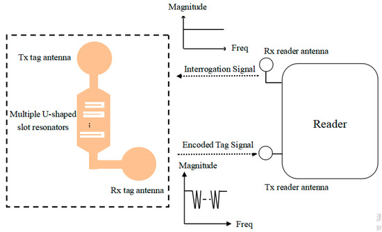 Figure 2 shows the working principle diagram of multiple U-shaped slot resonators with retransmitting chipless tags. First, the reader sends a UWB interrogation signal with a uniform spectrum. Afterward, the receiving antenna of the tag receives the interrogation signal, which is transferred through the resonance circuits to the tag’s transmitting antenna. During the transmission process, the uniformly UWB spectrum structure is changed by the U-shaped slot resonators, and the encoding information on the tag is loaded into the spectrum of the UWB interrogation signal. The UWB signal loaded with encoded information is retransmitted back to the RFID reader by the tag. Then, the data information can be demodulated through the decoding algorithm. The spectral signature of the multiple U-shaped slot resonators has band-stop characteristics at the different resonance frequencies. The resonant frequency point and the data bit are in a 1:1 correspondence (n resonators = n bits), which appears as a notch in the spectrum. When the reader recognizes that the spectrum-characteristic notch exists, the logic state is “1”, and the absence of the spectrum characteristic notch is represented by the logic state of “0”. The polarization characteristics of the reader transmitting antenna and the tag receiving antenna are consistent, and the reader receiving antenna’s polarization characteristic is consistent with the tag transmitting antenna. The transceiver antennas of the reader have orthogonally polarized to each other to maximize the isolation from the continuous interrogation and the encoded modulation signals and avoid mutual interference in the antennas [22]. The polarization characteristics of the tag transceiver antenna are also the same.