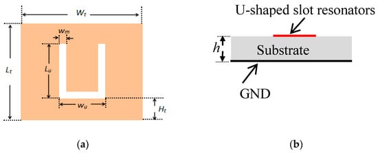 The U-shaped slot is widely used in the patch antenna design [38,39]. The structural parameters of a U-shaped slot of chipless tag are shown in Figure 3, where Lt is the width of the microstrip line, Wt is the length of the microstrip line, and Lu is the length of the U-shaped slot. Wm is the slot width of the U-shaped slot, wu is the length of the bottom side of the U-shaped slot, Ht is the distance from the U-shaped slot in the microstrip line, and h is the thickness of the substrate.