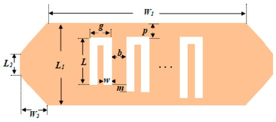 Multiple side-by-side U-shaped slot resonators placed parallel to each other are etched on the microstrip line to form a multi-bit chipless tag, visible in Figure 4, where the L1 is the width of the microstrip line, W1 is the length of the microstrip line, L is the length of the shortest U-shaped slot resonator, and m is the side length difference between adjacent U-shaped slots. w is the slot width of the U-shaped slot resonator, and all U-shaped slot resonators have the same slot width. g is the length of the bottom side of the U-shaped slot resonator and is fixed and consistent with the length of the microstrip line. The distance between adjacent U-shaped slot resonators is b. Different resonance frequencies can be obtained by changing the length of a U-shaped slot resonator. A trapezoidal microstrip is used as a transition belt for impedance matching between the microstrip transmission line and the 50-ohm feeder, which plays the role of a gradual transition to impedance, and the reflection will be suppressed.