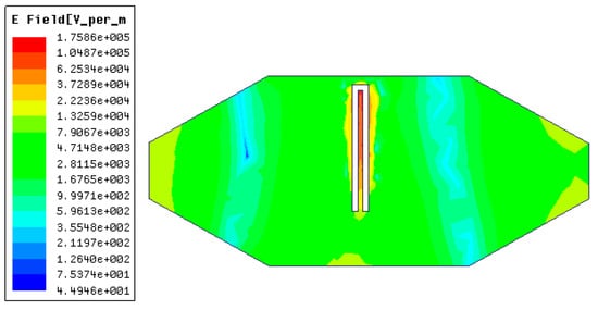 U-shaped slot resonators are designed on the F4BM substrate. The relative dielectric constant, loss tangent, and substrate thickness are 2.2, 0.0007, and 1.00 mm, respectively. The High-Frequency Structure Simulator (HFSS) is used for the modeling and the simulation of a single U-shaped slot resonator. Figure 5 shows a schematic of the electric field distribution of a single U-shaped slot resonator. The electric field is strongest near the U-shaped slot, indicating that the U-shaped slot has resonated.