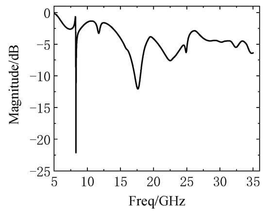 The transmission characteristic curve of the single U-shaped slot resonator S21 is shown in Figure 6. When the side length of the single U-shaped slot resonator is 7 mm, the fundamental frequency of the resonator is 8.28 GHz, and the notch depth of the spectrum characteristic achieves −22 dB. Moreover, the impedance bandwidth B is 0.04 GHz. Q-value is about 207.
