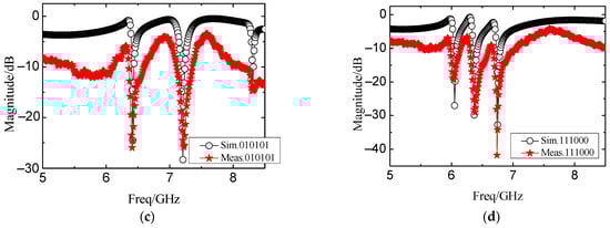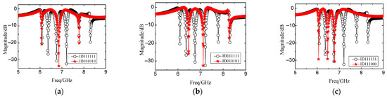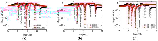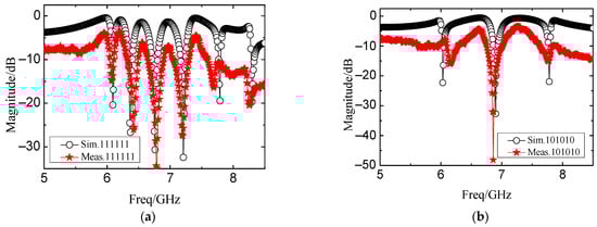 Figure 7 and Figure 8 show the resonance curves of the 4-bits coding tags, namely ID111111, ID111000, ID101010, and ID010101. The ID111111 tag is considered the reference tag. The six resonance spectral notches of the reference tag ID111111 are 6.09, 6.37, 6.76, 7.21, 7.79, and 8.30 GHz, respectively. The notch depth of the spectrum characteristic is between −19 dB and −32 dB. The corresponding spectrum width of each resonator is narrow. The spectrum notch is deep, and the spectrum utilization rate is high.