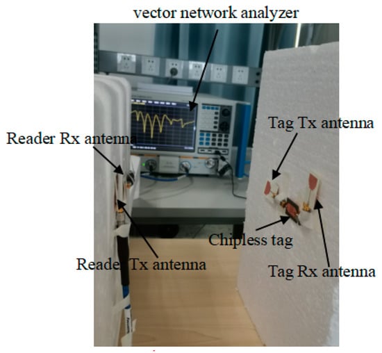 The experimental setup architecture was composed of a UWB reader and a chipless tag. The two ports of the network analyzer were, respectively, connected to the UWB antennas, which were orthogonal to each other to improve the transceiver isolation of the reader. The chipless tag needed two orthogonal transceiver antennas; similarly, the chipless reader also needed two orthogonal transceiver antennas which would not affect each other. The polarization characteristics of the transmitting antenna of the reader and the receiving antenna of the tag were the same. The polarization characteristics of the receiving antenna of the reader and the transmitting antenna of the tag were the same. The receiving antenna of the reader received the signal that was transmitting from the tag; however, the transmitting antenna of the reader would not receive any signal from the tag.