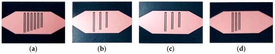 Picture of U-shaped slot resonator chipless tags: (a) ID111111; (b) ID101010; (c) ID 010101; (d) ID 111000.