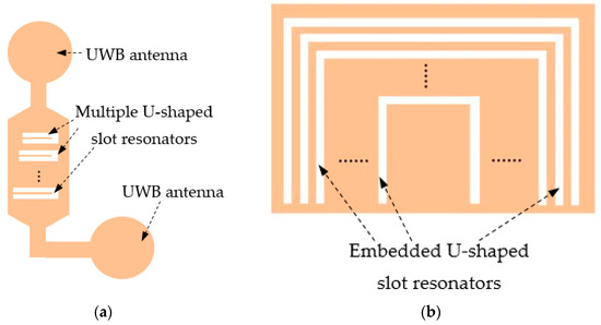 The U-shaped slot resonator is used in retransmission chipless tag RFID systems. It brings a lot of advantages to this design. To compare it to other similar work, Figure 13 shows the schematic diagrams of our design and the other U-shaped slot chipless tag [34]. Our work is shown in Figure 13a. Md Aminul Islam et al. [34] used embedded U-shaped slots based on self-resonance. The electric field must be excited along the direction of the U-shaped slot opening. In our work, the Rx UWB antenna received the interrogation signal and the cascade U-shaped slot resonators changed the structure of the UWB spectrum. Then, the Tx UWB antenna transmitted them to the reader. For our design, the strength of retransmission signal is much greater than the comparison tag in Figure 13b. The coupling effect between the resonators is weak. The chipless tag in our design has high sensitivity, is long in distance, is omnidirectional, etc.