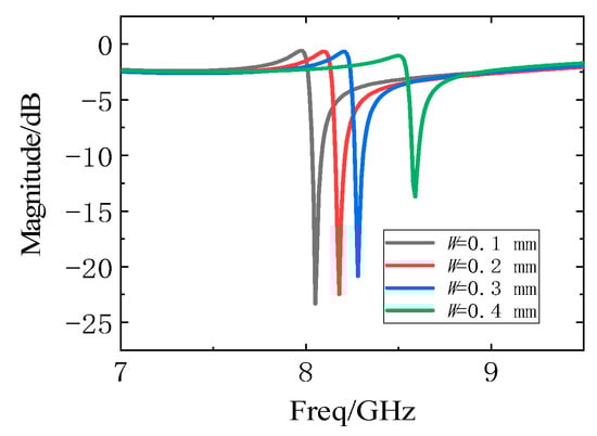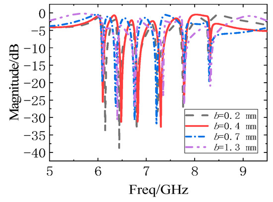 The resonance frequency of a U-shaped slot resonator is determined by the length of the slot and the influence of other parameters, such as the slot width (w) of the U-shaped slot and the distance (b) between the resonators, which are shown in Figure 14 and Figure 15. When the length of the U-shaped slot resonator is 7 mm, the resonance curves corresponding to the change in w from 0.1 mm to 0.7 mm in steps of 0.1 mm is shown in Figure 14. When the slot w changes, the width of the resonance point is unchanged. As the w of the slot narrows, the resonance frequency decreases, and the notch corresponding to the resonance point deepens. The resonance characteristics of b are adjusted to study the coupling effect of U-shaped slot resonators (Figure 15). The b decreases and the notch depth of the resonators deepens, but the resonance frequency is almost unchanged, indicating that U-shaped slot resonators are minimally affected by the coupling effect.