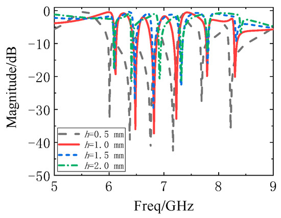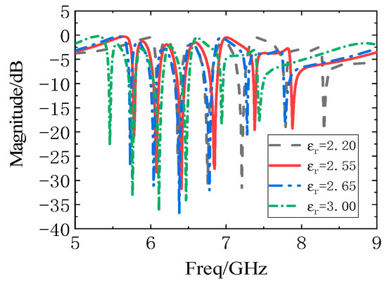 The resonance characteristics of tags with different dielectric constants (Figure 16) and dielectric thicknesses (Figure 17) are studied to directly print the chipless tag of the U-shaped slot resonator structure on materials of different thicknesses, like a barcode. Figure 16 shows that, when the dielectric constant of the medium is 2.2, 2.55, 2.65, and 3.0, the resonance frequency decreases with increasing dielectric constant εr. When the printed materials are different, the frequency position needs to be re-encoded, and the frequency position code of the reference tag needs to be re-encoded. Figure 17 illustrates the tag resonance curve obtained by changing the substrate thickness from 0.5 mm to 2 mm in steps of 0.5 mm. The resonance frequency corresponding to the U-shaped slot resonator changes slightly when the thickness is changed, but the resonance frequency increases as the thickness increases.