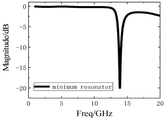 Figure 18 and Figure 19 show the resonance curves of the resonator with the longest side length and the resonator with the shortest side length, as the number of resonators constituting the chipless tag is increased to 31 bits. Through HFSS software simulation, it was found that the side length of the U-shaped slot resonator with the shortest side length and the longest side length is 2.9 mm and 11 mm, respectively. The side length difference between adjacent resonators is 0.27 mm. At the same time, the width of all U-shaped slot resonators is the same, at 2.9 mm. The dimension of the 31-bits chipless tag is 113.94 mm × 21.2 mm. The cascades of the U-shaped resonators are arranged side by side. The resonant frequency of the shortest resonator in the 31-bits chipless tag is 13.88 GHz. Meanwhile, the longest resonator corresponds to a resonant frequency of 4.7 GHz.