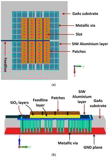 The proposed AoC is constituted from several stacked layers comprising Cu–SiO2–Cu–SiO2–Al–GaAs–Cu as shown in Figure 1. The top layer consists of a 2 × 4 array of rectangular copper patches. Etched on the patches is a row of subwavelength circular slots. The antenna is excited using proximity coupling at the patch edge, which is analogous to a gap coupling patch. This is achieved with a microstrip coplanar waveguide feedline, which is created by having both sides next to the feedline grounded. The feedline is sandwiched between the two silicon oxide layers, below which is a layer with aluminium patches that are separated from each other by a narrow gap. This layer acts like a partially reflective surface. The outer periphery of the aluminium patches is studded with an arrangement of densely lined metallic posts or vias connecting it to the ground-plane through the GaAs substrate to create a SIW electromagnetic resonant cavity. Incident electromagnetic waves that penetrate through the gaps in the aluminium layer are reflected at the ground-plane. The thickness of the GaAs substrate is such that the phase shift of the ground-plane reflected waves is in phase with the waves reflected at the surface of the copper patches. With this arrangement, the aluminium surface acts like an artificial magnetic conductor (AMC) that fully reflects incident waves with a near zero degrees reflection phase []. This configuration results in significantly enhanced directivity. The circular slots across the rectangular patches act like miniature resonators that radiate energy at the THz band. The antenna was implemented on a GaAs substrate of 100-micron thickness, a dielectric constant of 12.94, and a loss-tangent of 0.006.