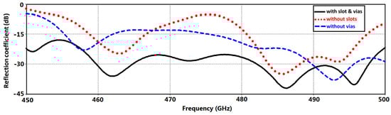 Reflection-coefficient response of the proposed AoC (i) without metamaterial slots, (ii) without metallic vias, and (iii) with metamaterial slots and metallic vias.