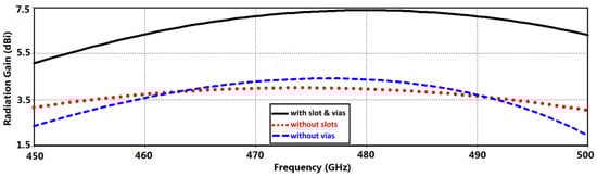 Radiation gain as a function of the frequency of the proposed AoC (i) without metamaterial slots, (ii) without metallic vias, and (iii) with metamaterial slots and metallic vias.