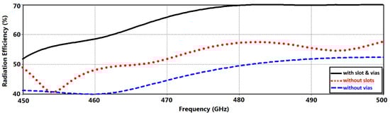 Radiation efficiency as a function of the frequency of the proposed AoC (i) without metamaterial slots, (ii) without metallic vias, and (iii) with metamaterial slots and metallic vias.
