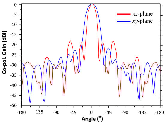 The E-plane and H-plane radiation patterns of the proposed AoC at 0.45 THz are shown in Figure 5. Clearly, the radiation patterns exhibit relatively high directivity in both planes. The half-power beam width in the xy-plane is 26° and that in the xz-plane is 17°. In addition, the side-lobe and back-lobe levels are all below −17.5 dBi in the xz-plane and below −22 dBi in the xy-plane.