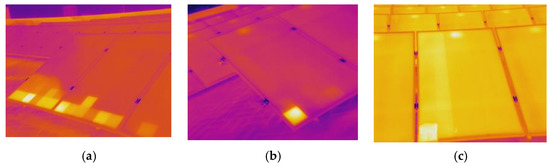 Infrared (IR) thermographic images of PV panels under partial shading showing hotspots: (a) shading from the panel in the front row, (b) un-expected shading on a bottom left cell, and (c) shading caused whole PV sub-module bypassed.