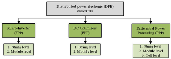 Furthermore, there are also power electronic (PE)-based architectures to mitigate the effects of mismatches, which are presented in the literature at the PV string-, panel-, subpanel-, and cell-level, as shown in Figure 4. These PE architectures typically include microinverters, DC optimizers, and partial or differential power processing (DPP) converters. The PE converters are also known as distributed maximum power point tracking (DMPPT) converters as they track the MPP of each panel individually [15,16,17]. The main advantage of distributed power electronics (DPE) is the mitigation of mismatch effects in a PV system. Moreover, the DMPPT increases the energy yield of the overall system [18,19,20,21,22,23,24,25,26,27,28,29,30]. Additionally, DPE converters can also help in the improvement of the system reliability by reducing the hot-spots shown in Figure 3. However, the major and essential drawback of DC optimizer and microinverter architectures is the full power processing (FPP) by each PE converter. Hence, converters with full power ratings are necessary, which not only increases the losses but also the size of the PE converter.