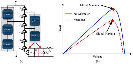 (a) Diffusion charge redistribution (DCR) DPP architecture; (b) power–voltage (P-V) characteristics during mismatch and without mismatch using [17].