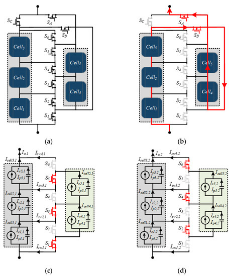 A photovoltaic (PV) system with five series-connected PV cells: (a) general schematic; (b) Mode 1; (c) Mode 2; (d) Mode 3.