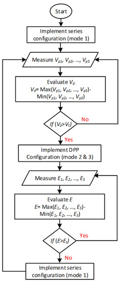 The examination of the proposed work is performed by considering a system similar to a system shown in Figure 7. For the examination, five PV panels are considered, where each panel consists of twelve series-connected PV cells. The proposed reconfiguration algorithm is presented in Figure 8. In the proposed work, the voltage and irradiance across each PV panel are measured. Based on these measured values, the algorithm performed a reconfiguration. Firstly, the voltage differences are calculated. If the voltage differences exceed a certain defined threshold value, it indicates that there is a mismatch between the series-connected panels. Hence, the algorithm converts the series system into a DPP system. Afterward, the irradiances over the PV panels are measured to monitor the status of the system that the mismatch still exists or not. If the irradiance difference over the PV panels is less than a defined threshold, the algorithm brings the system back to a series-connected system. The algorithm is tested under various partial shadings cases in PSIM, as discussed in the following section.