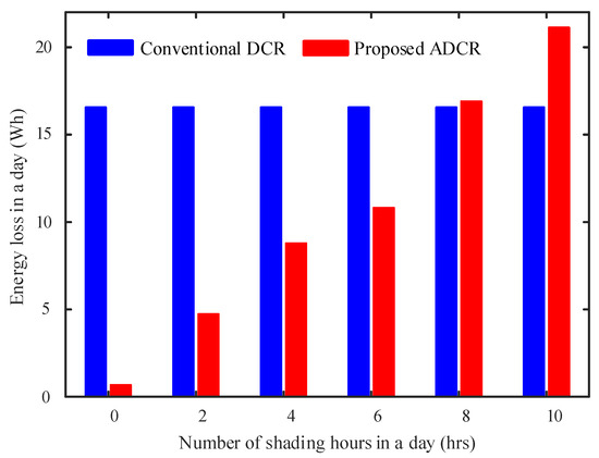 In Figure 12, the introduced reconfiguration architecture in Figure 9 is compared with the existing conventional DCR architecture in Figure 7a. The comparison is based on the energy loss in a day by considering the peak sun hours (PSH) to be equal to ten. For evaluation, a 1.180 kW system is considered consisting of 59 solar PV panels, where 30 series-connected panels are connected in parallel with a switched ladder-based string consisting of 29 series-connected PV panels, which are used for charge transfer. The rating of each solar PV panel is given in Table 1. The MOSFETs used for evaluation are IRF9910, which is switching at 100 kHz in DPP mode. Six different scenarios are considered, as shown in Figure 12, i.e., 0, 2, 4, 6, 8, and 10 h of shading in a day. The shading pattern is similar to mismatch Case 2 in Figure 9, where one panel from a string consisting of an N panel and the other from N-1 is shaded. It can be seen from Figure 12 when the shading is less than 8 hours in a day that the introduced ADCR lost less energy than the conventional DCR. However, if the system has a shading of 8 hours or more, the introduced ADCR lost more energy than the conventional approach. However, the introduced ADCR is more effective as compare to traditional DCR because the number of shading hours in a day is very less or even there is no shading throughout the day.