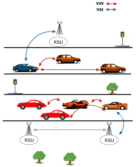 People die and get injured in traffic accidents all over the world. It is mandatory for all vehicles to get information about traffic and road conditions to avoid accidents [1]. To cater to this issue, an effective and efficient transport management system is required to minimize road accidents and congestion, as specified in [2]. It is mentioned in [3] that 60 percent of accidents can be avoided if warning messages are delivered to drivers before accidents. Hence, scientists have introduced vehicular ad-hoc networks (VANETs), which turn every vehicle into a wireless node that can communicate with other vehicles. The VANET is a special class of mobile ad-hoc network (MANET) formed by vehicles equipped with wireless gadgets. VANET communication takes place between vehicle to vehicle (V2V) mode and vehicle to roadside unit (RSU), forming an intelligent transport system as shown in Figure 1. The Wireless Access Vehicular Environment (WAVE) was adopted from 802.11a and is used in intelligent transportation systems (ITS). In VANET, vehicles communicate with each other to share information required for safety, comfort, entertainment and low latency purposes.