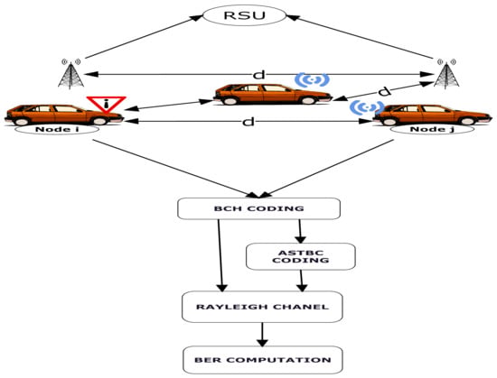 A vehicular network with N number of nodes is considered for modeling our propagation channel. d is the transmission range in meters. Figure 3 depicts the simulation model in which node i is communicating with node j. Consider a scenario in which node i is approaching node j which is decelerating. Node j will send a warning message to node i. We have simulated the scenario and have compared our results with simulated BER in the Rayleigh channel. Our BER computational approach with node i and node j is described in the next subsections. The simulations were performed in Matlab, as Matlab is user-friendly, and developing computational code and plotting graphs is easy in Matlab.