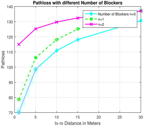 where represents path loss exponent; corresponds to a parameter for different numbers of blockers. The middle term in Equation (1) represents atmospheric attenuation for 60 GHz. The simulation parameters are shown in Table 2.