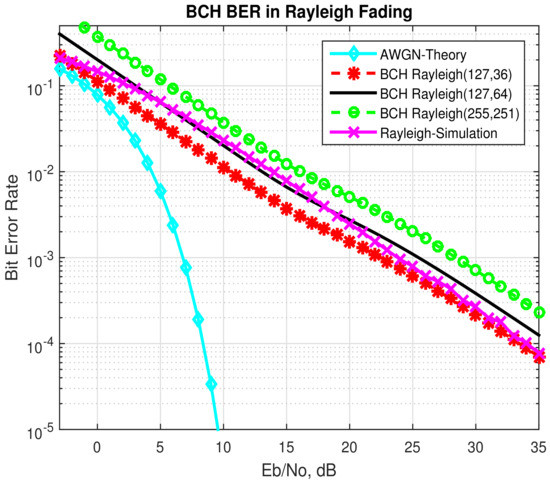 The bit error rate was computed for different values of the code rate, i.e., (127,64), (127,36) and (255,251) using Equation (14).
