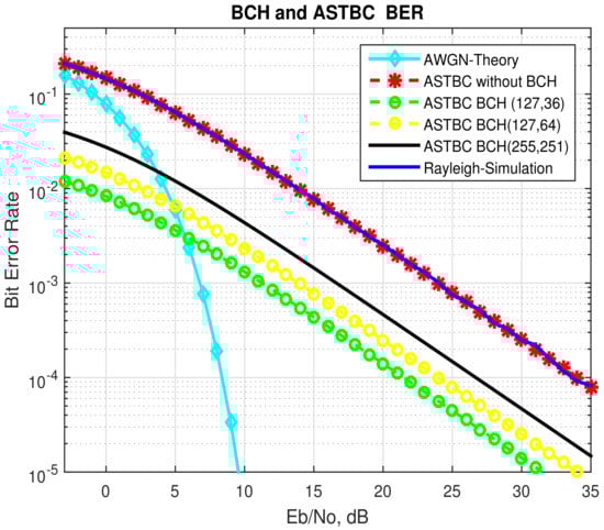Using our derived closed-form expressions of BER, we simulated the BER of our proposed BCH in Rayleigh fading and the BER of concatenated ASTBC and BCH coding. The results showed that the BER using concatenated ASTBC and BCH coding was the most depleted. The result of the proposed approximation, i.e., expression 19, was compared with the orthodox BER ASTBC expression. The results showed that the BER using BCH-coded ASTBC was less than the BER using the orthodox expression for BER. The results were compared using different code rates. The BER using code rate 12,732 was the smallest.