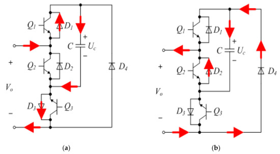 Figure 3 shows the equivalent circuit for two bypass modes of CSSM separated from the converter in normal operation mode. When the current is flowing into the (+) terminal of the submodule, it bypasses through IGBT Q2 and diode Q3 as shown in Figure 3a. When the current is flowing out of the (+) terminal of the submodule, the converter and submodule can be separated by bypassing the current through IGBT Q3 and diode Q2 as shown in Figure 3b.
