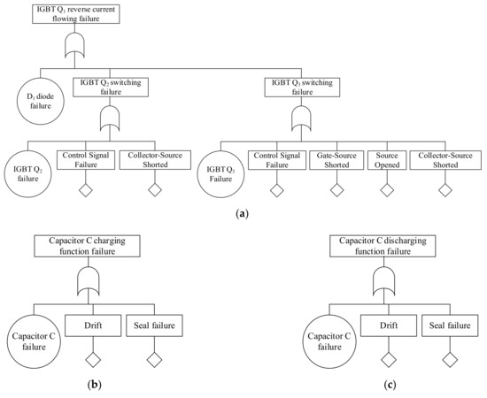 Figure 6a shows sub fault-tree for the ‘IGBT Q1 reverse current flowing failure’ event. It is designed by OR-gate combination of ‘D1 diode failure’, ‘IGBT Q2 switching failure’, and ‘IGBT Q3 switching failure’. CSSM consists of three IGBTs in series. Therefore, although the current is flowing through diode D1, a failure may occur due to the switching error of IGBT Q2 and Q3. At this time, in case of being located at the edge such as IGBT Q3, in addition to IGBT’s failure and switching signal error, ‘Gate-Source Shorted’, ‘Source Opened’, ‘Collector-Source Shorted’ failure is considered, and in the case of centrally located IGBT Q2 considers only the ‘Collector-Source Shorted’ fault. ‘Capacitor C charging function failure’ and ‘Capacitor C discharging function failure’ in Figure 6b,c are designed as sub-failures of the capacitor itself and frequent ‘Drift’ and ‘Seal failure’ among major failures of the capacitor. In Figure 6d, ‘IGBT Q3 reverse current flowing failure’ is represented by the duality of diodes D3 and D1 and IGBT Q3 and Q1 in Figure 6a. Figure 6e shows the sub fault-tree of ‘IGBT Q2 reverse current flowing failure’. It is designed by OR-gate combination of ‘D2 diode failure’, ‘IGBT Q3 switching failure’, and ‘IGBT Q1 switching failure’. CSSM consists of three IGBTs in series, so if current flows through diode D2, a failure may occur due to switching errors of IGBT Q1 and Q3. Since IGBT Q1 and Q3 are located at the edge, IGBT’s own failure ‘IGBT Qx Failure’ and switching signal error ‘Control Signal Failure’ are the main causes of failure. Additionally, the cause of failure of ‘Gate-Source Shorted’, ‘Source Opened’, and ‘Collector-Source Shorted’- is considered as shown in Figure 6e.