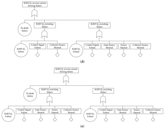 Sub fault-tree: (a) IGBT Q1 reverse current flowing failure; (b) Capacitor charging function failure; (c) Capacitor discharging function failure; (d) IGBT Q3 reverse current flowing failure; (e) IGBT Q2 reverse current flowing failure.