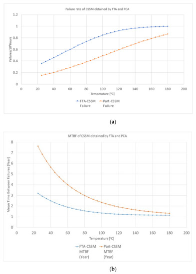 Figure 8 compares the failure rate and mean time between failures (MTBF) obtained by PCA and FTA. In both approaches, the part failure rate of the IGBT, diode, and capacitor is applied equally based on the fault library of MIL-HDBK-217F. FTA shows 0.35703 Failures/104 h at 25 °C, and the MTBF is 28,009 h, so a 3.2-year life-cycle is expected. At 180 °C, it shows a failure rate of 0.997 Failures/104 h, and the MTBF is 10,032 h, so it can be expected that the life-cycle will be shortened to 1.15 years.