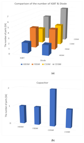Figure 10 shows a comparison of the number of parts for HBSM, FBSM, CDSM, and CSSM. In the comparison of IGBT and diode in Figure 10a, HBSM shows the smallest number of components, and the submodule with DC short current protection has a large number of components and CDSM has the highest number of semiconductor devices. CSSM shows that it has DC short current protection, but requires one smaller number of IGBT than FBSM. The comparison of the number of capacitors in Figure 10b shows that only CDSM requires two capacitors.