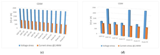 In HBSM, FBSM, and CDSM, the voltage stress of the IGBT and diode is the same as 2400 V, and the current stress is also shown to require the same current rating at 1000 A at 2.4 MW power rating. In the case of CSSM, three IGBTs are coupled in series, and the voltage stress of the IGBTs and diodes at both ends is reduced by 50% compared to other submodules. Therefore, CSSM is advantageous in terms of cost because it is possible to use a relatively low voltage rated IGBT and a diode.