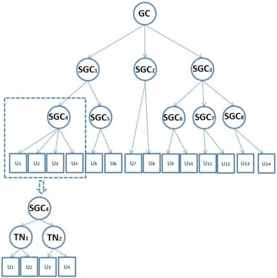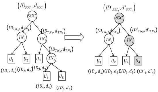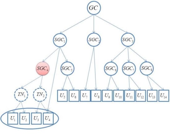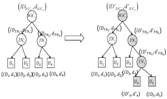 The GC firstly builds a key tree for the group members and SGCs, as shown in Figure 2. In the key tree, the root is associated with the GC, the internal nodes correspond to the SGCs, and the leaves are the group members. The structure of the key tree is determined by the distribution of the SGCs and group members. However, an SGC may maintain many group members in reality, and this subtree, whose root is the SGC, is not an efficient tree like . The size of the subtree’s rekeying message is , where n is the number of subgroup members. To reduce the size, the subtree can be adjusted to a binary tree, and the size of the rekeying message is then . As shown in Figure 2, changes the original tree to a binary tree by adding temporary nodes denoted as . At the same time, if a GC or SGC has too many next-level nodes, the tree can also be adjusted using . A temporary node is managed by the node that generates it. Each is encoded by the location of the node in the key tree. The information of contains the upper level’s . Each node in the key tree has two parts: (1) a version of public parameters; (2) an identifier and private key.