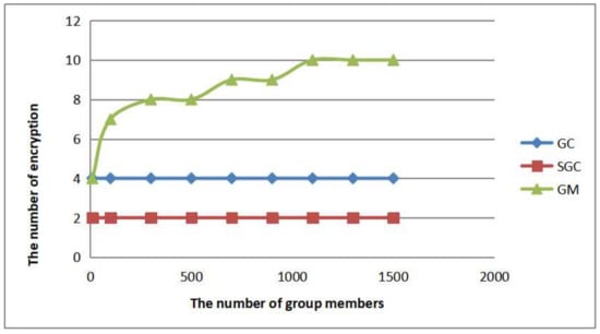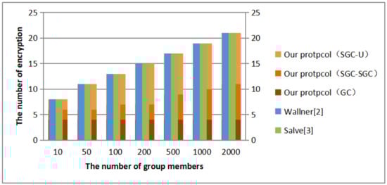 In Figure 7, the vertical axis is the number of encryption, which means the operation of generating KEK, which is an important factor of computational overload. These three protocols are based on LKH. When the numbers of group members are the same, the total encryption times of the three protocols are the same. The proposed protocol achieves the optimum load balancing effect, the workload of the GC is shared by some SGCs.
