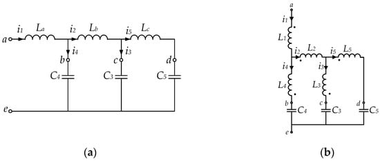 The second step is to establish the design equations for the multi-coupled coils structure. Figure 3b shows the passive filter with multi-coupled coils. In Figure 3a,b, the values of capacitor C3, C4, C5 are the same. To make the network shown in Figure 3b equivalent to the network in Figure 3a, it is necessary to ensure that when the two networks have the same excitation, the voltages at point a, b, c, d and the current i1, i2, i3, i4, i5 in the two figures are the same. Moreover, according to this relationship, formulas are as follows: