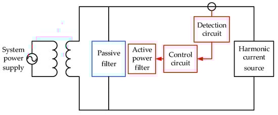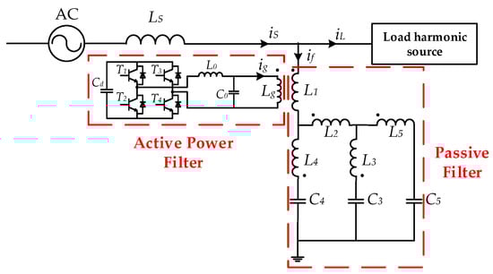 - The active power filter that is in parallel with the passive filter [10,11]. In this type of topology, the active power filter is connected to the power grid through a transformer, whose volume is large. The topology is simple, but on the low-voltage side of the transformer, the current is relatively large. Besides, the output current of the active power filter may flow into the parallel PF.