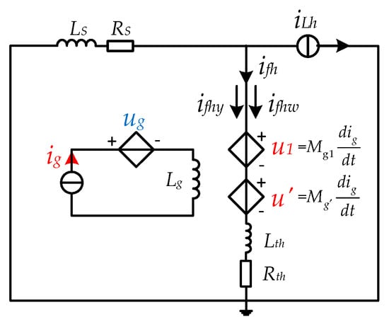 The self-inductance and mutual inductance of each coil in Figure 1b were measured. The measurement results show that the mutual inductance Mg1 (between L1 and Lg) and Mg3 (between L3 and Lg) are much larger than Mg2 (between L2 and Lg), Mg4 (between L4 and Lg), and Mg5 (between L5 and Lg). Therefore, to simplify the theoretical analysis, the mutual inductance Mg2, Mg3, Mg4, Mg5 are combined to an equivalent inductance Mg’ in Figure 6, where u’ represents the equivalent induced voltage source generated in the filter branch by Mg’. For the characteristic harmonic, the impedance of the passive filter branch is very small. Lth and Rth represent the equivalent inductance and resistance of the passive filter branch at harmonic frequencies, respectively. Ls and Rs represent the supply-system inductance and resistance, respectively.