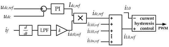 The sum of idc,ref and iL0h,ref is iL0,ref, which is the input of the current hysteresis control module. The output of the current hysteresis control module is the PWM control signal of the active converter. The current hysteresis control can directly track the current at high speed, so the converter can be considered as a current source.