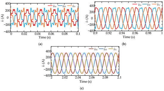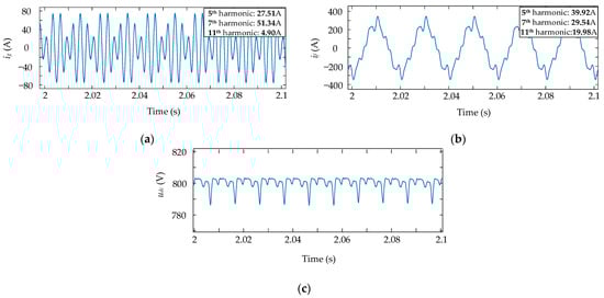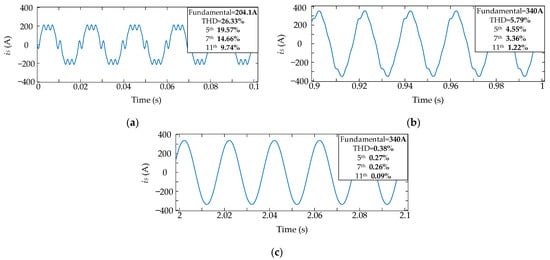 In addition, it can be seen that in Figure 11a, the amplitude of the fundamental component of iS is 204.1 A. While in Figure 11b,c, the amplitude of the fundamental component of iS is 340 A, which is larger. The reason is that after the passive filter works, the capacitive fundamental current increases, which can compensate the inductive current in the grid.