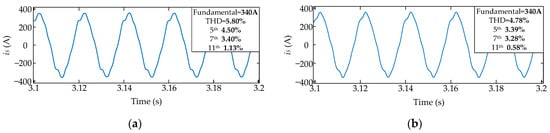 From Figure 11a, it can be seen that without any compensation, the total harmonic distortion (THD) of iS is 26.33%. Further, the distortion of 5th, 7th, and 11th harmonics of iS are 19.57%, 14.66%, and 9.74%, respectively. From Figure 11b, it can be seen that with passive compensation, the THD of iS is reduced to 5.79%. Further, the distortion of 5th, 7th, and 11th harmonics are 4.55%, 3.36%, and 1.22%, respectively. From Figure 11c, it can be seen that the THD of iS is reduced to 0.38%. The distortion of 5th, 7th, and 11th harmonics are 0.27%, 0.26%, and 0.09%, respectively.