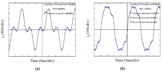 From Figure 19a, it can be seen that iS contains the obvious 3rd harmonic. The amplitude of the fundamental component of the supply current iS is 23.65 A and the THD is 60.95%. The distortion of the 3rd harmonic of supply current iS is 60.68%.