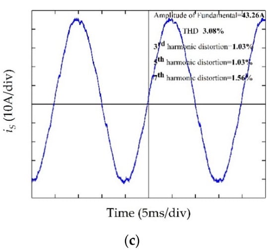 From Figure 19c, it can be seen that the amplitude of the fundamental component of the supply current iS is 43.26 A and the THD is reduced to 3.08%. The 3rd, 5th, 7th harmonics of iS are greatly eliminated. Thus, it is reasonable to conclude that the proposed hybrid compensation method is feasible.