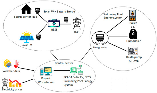The swimming pool energy system is monitored with a SCADA system and comprises a boiler, heat pump, and air handling unit (AHU). Besides the physical equipment installed in the sports centre, i.e., the PV system components and energy metering, temperature and humidity sensors, the pilot incorporates a comprehensive set of virtual tools and software modules developed for its realization. The general physical view of the pilot site is presented in Figure 3, and the main components of the BESS are in Figure 4.