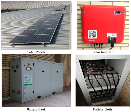 The BESS under test consists of a PV with a total capacity of 5.025 kWp, an inverter with 96.6% efficiency and a lithium-ion battery with a total nominal capacity of 1080 Ah. The PV modules are manufactured by JA Solar (Beijing, China) and consist of high-performance monocrystalline silicon panels. The corresponding technical parameters are presented in Table 1. The electrical characteristics correspond to standard test conditions (STC) (irradiation of 1000 W/m2, air mass (AM) spectrum 1.5 and a cell temperature of 25 °C). A total of 15 panels arranged in two arrays of seven and eight modules were installed on the rooftop of the sports centre at 41.47008° latitude and 2.08408° longitude. The total panels’ area was 25.5 sqm and the slop and azimuth were 10° and 31° respectively.
