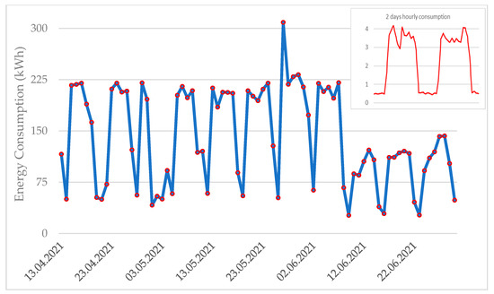 Daily energy consumption of the swimming pool complex. The consumption is measured every 15 min, every single point in the figure represents the sum of 96 measurements. In the zoomed area, hourly consumption for two days is shown, every four measurements are added to form the consumption of each hour in the day.