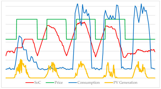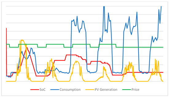 Figure 8 and Figure 9 show snapshots of the operation of the BESS system. To visually illustrate the operation of the battery charging/discharging algorithm, different scales for the SoC, price, electricity consumption and PV output were used. No axis labels were used in the figures as they are just presented to clarify how the SoC of the battery follows the changes in the price, consumption and PV generation. As shown in Figure 8, the state of charge of the battery follows the price signal. When the price goes up, NEMO discharges the battery and the SoC goes down, and when the price goes down, NEMO charges the battery and the SoC goes up. Figure 9 shows another scenario of the operation when the SoC signal follows the difference between the values of the PV output and the consumption of the pool. In this case, when the PV output was higher than the consumption of the pool NEMO charges the battery even if the price of the electricity was in higher tariff.