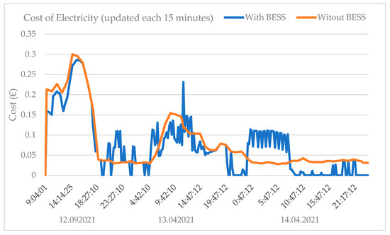 Cost of imported electricity at 15 min granularity. The cost of imported electricity with and without BESS is shown. The cost with BESS is higher than the cost without BESS when the BESS charges the battery and lower when discharges the battery.